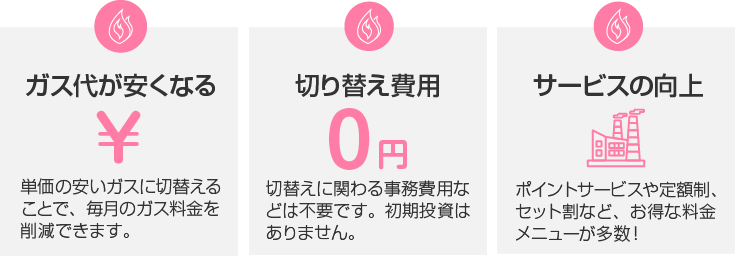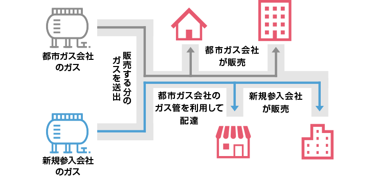 ガスには大きく分けて都市ガスとプロパンガスがあり、2017年4月から自由化されるのが都市ガスです。 プロパンガスは既に自由化されています。都市ガスについては、特に意識せずに地域のガス会社からガスを購入していたと思いますが、 これは地域の都市ガス会社がほぼ独占状態でガス提供しており、安定的にガス供給を目指す為「ガス事業法」という法律でも守られて きた仕組みによって成り立っていた事です。 今回のガス自由化でこの独占状態が一気に崩れ、他業種からも続々とガス事業へ参入してくる企業が増えてきます。